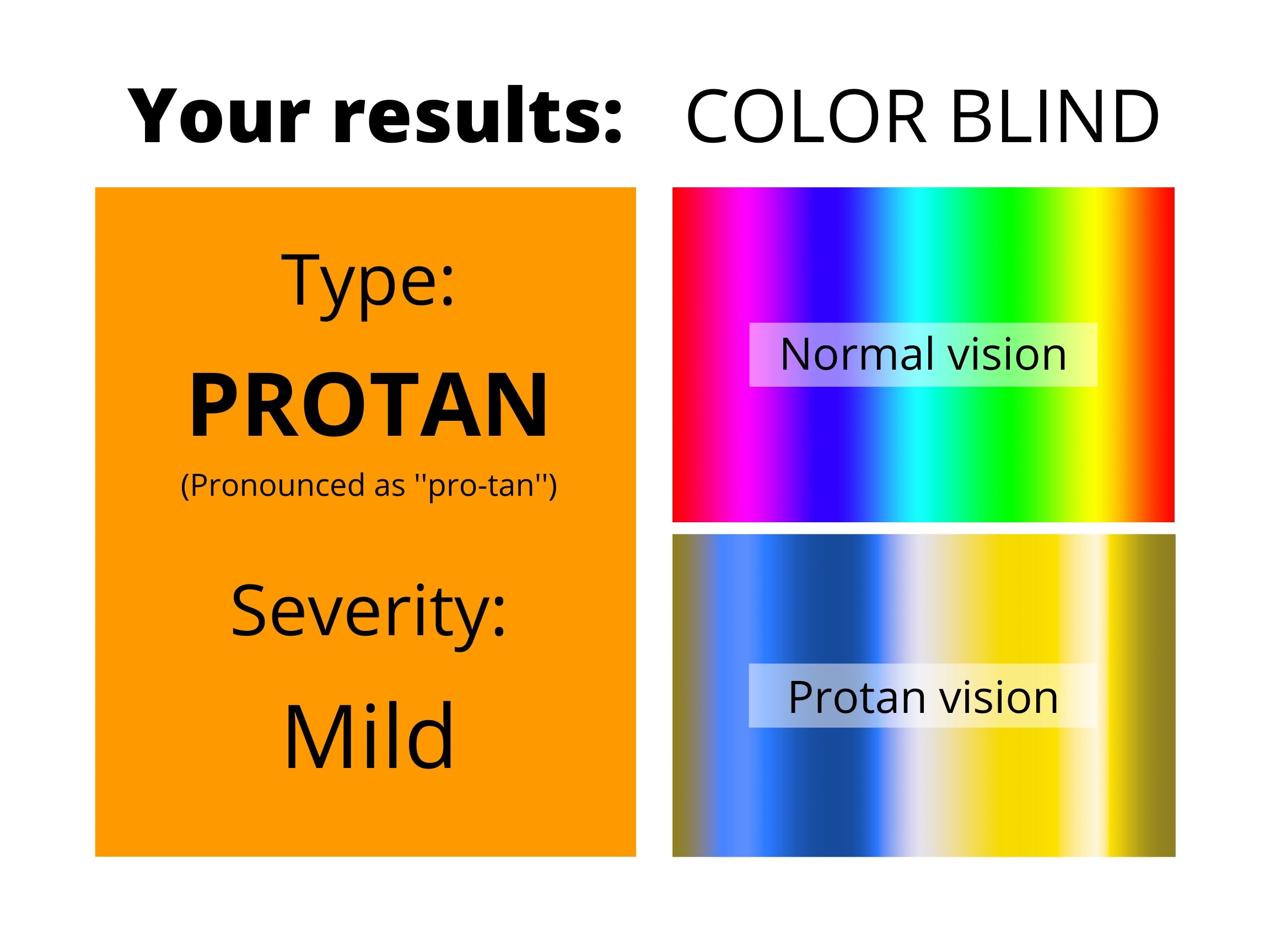 Someone with protan color blindness can only see 2-3 different hues of color compared to someone with normal color vision who can distinguish 7 hues of color.